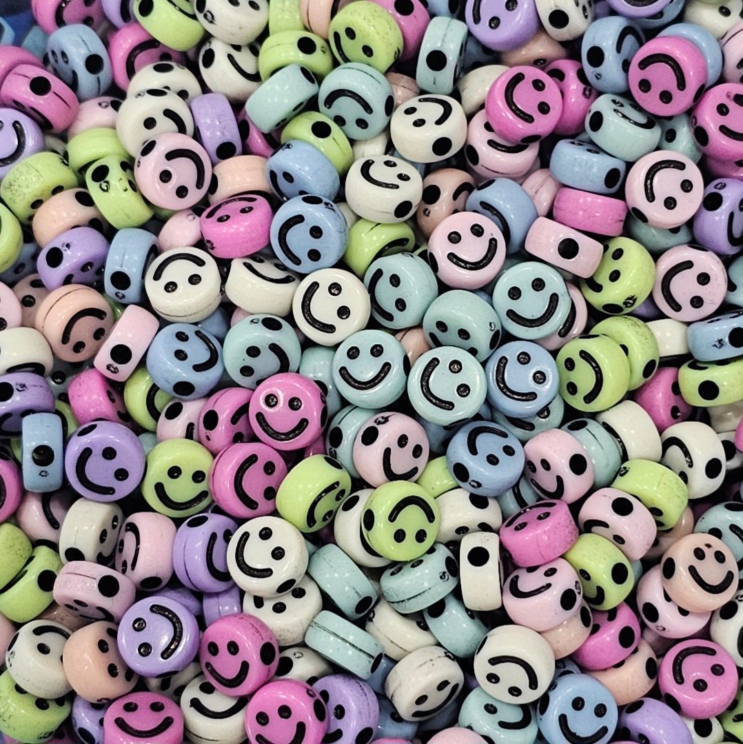 Acrílico con forma de luneta diseñada con carita feliz en tonos pastel multicolor de 1cm de diametro aprox, en 3 presentaciones:
