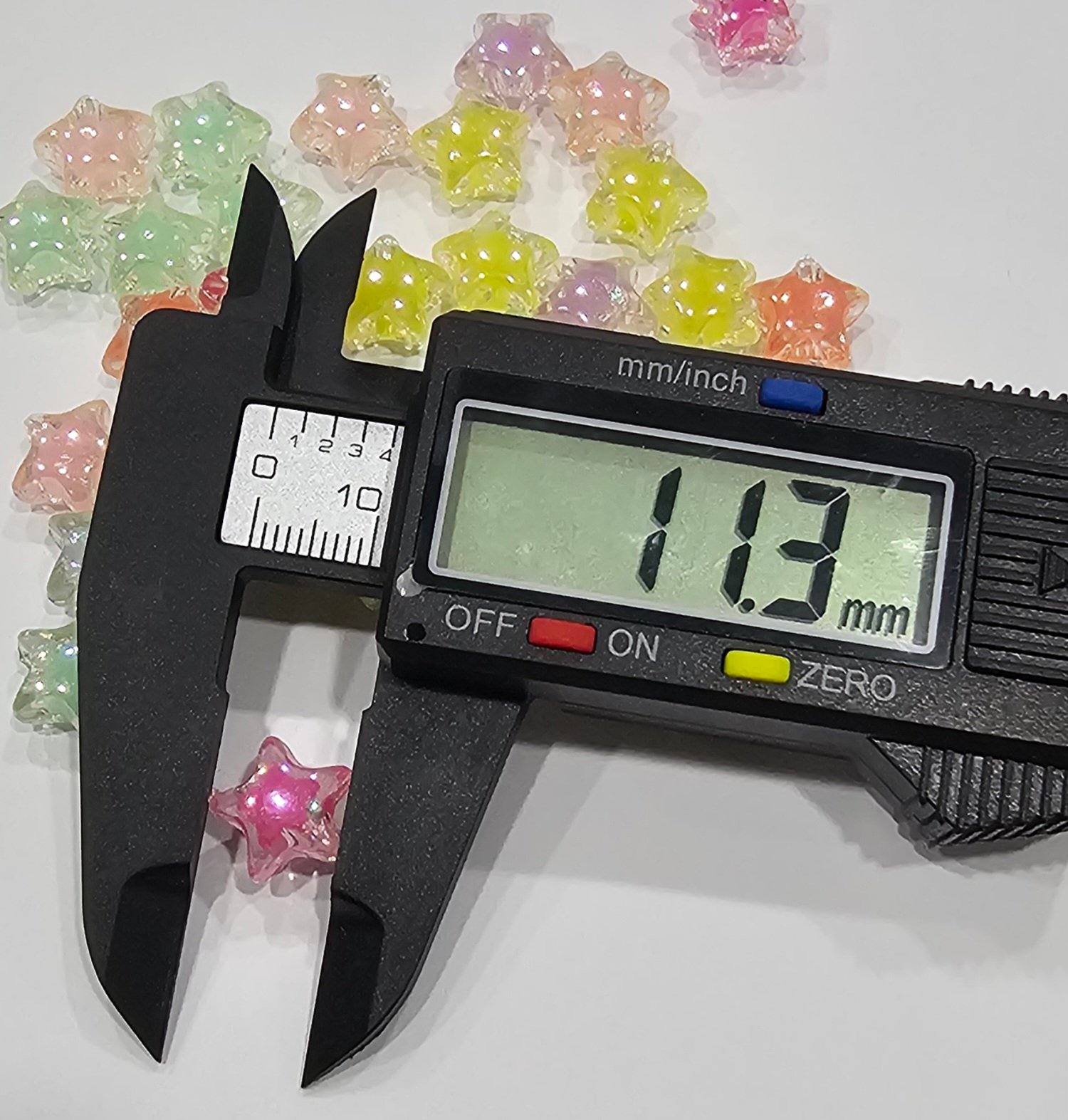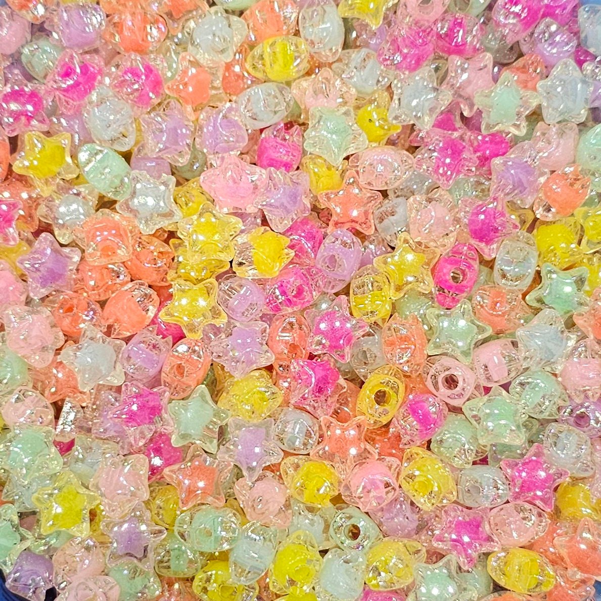 Acrílico con forma de estrella con tornasol con el color encapsulado de 1cm de largo aprox en 3 presentaciones:
