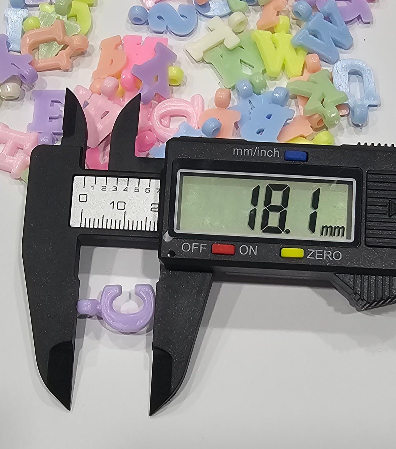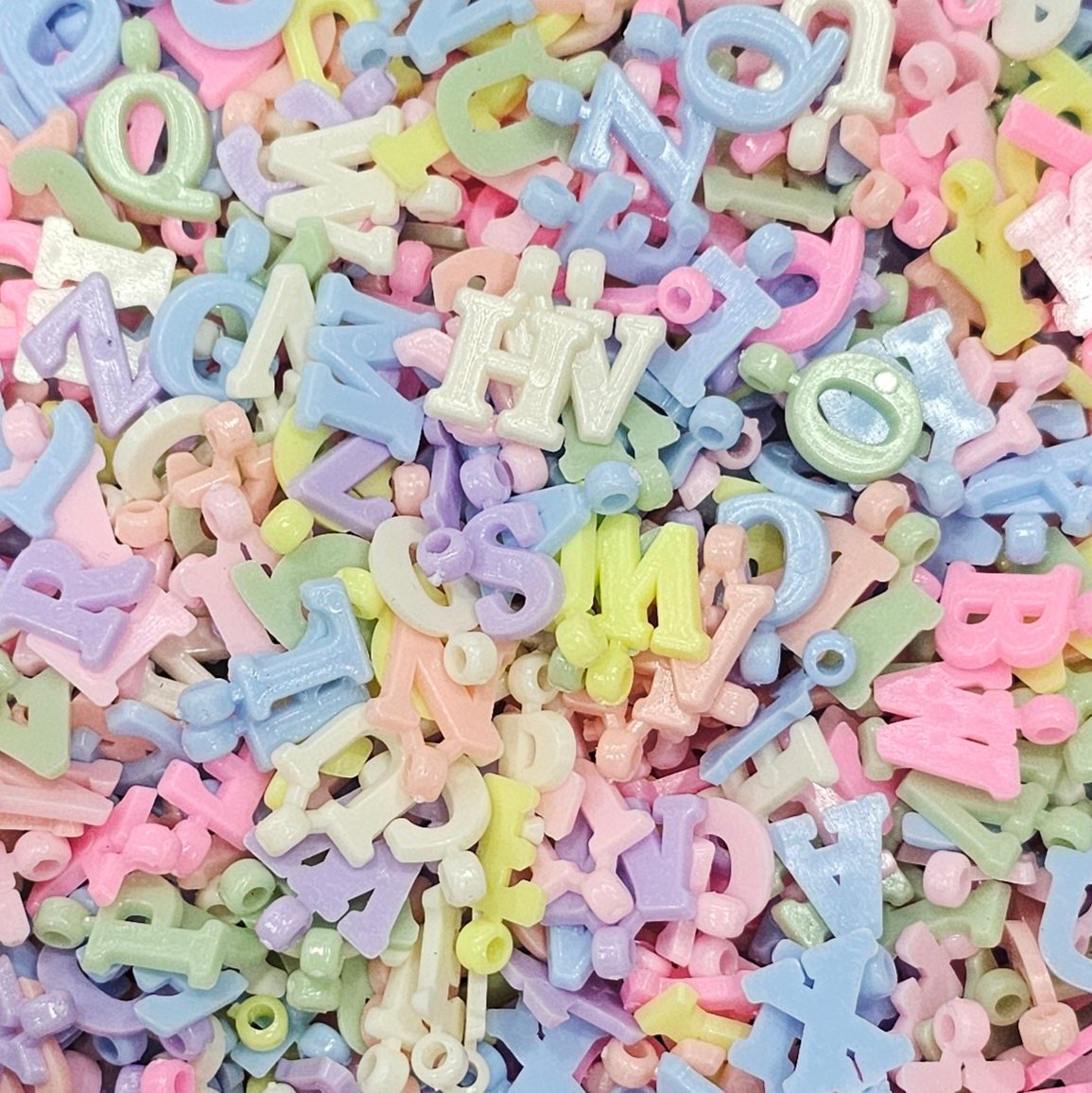 Acrílico con forma de letra de varios colores, plana y para usarse como dije de aprox 1.8cms en 3 presentaciones: