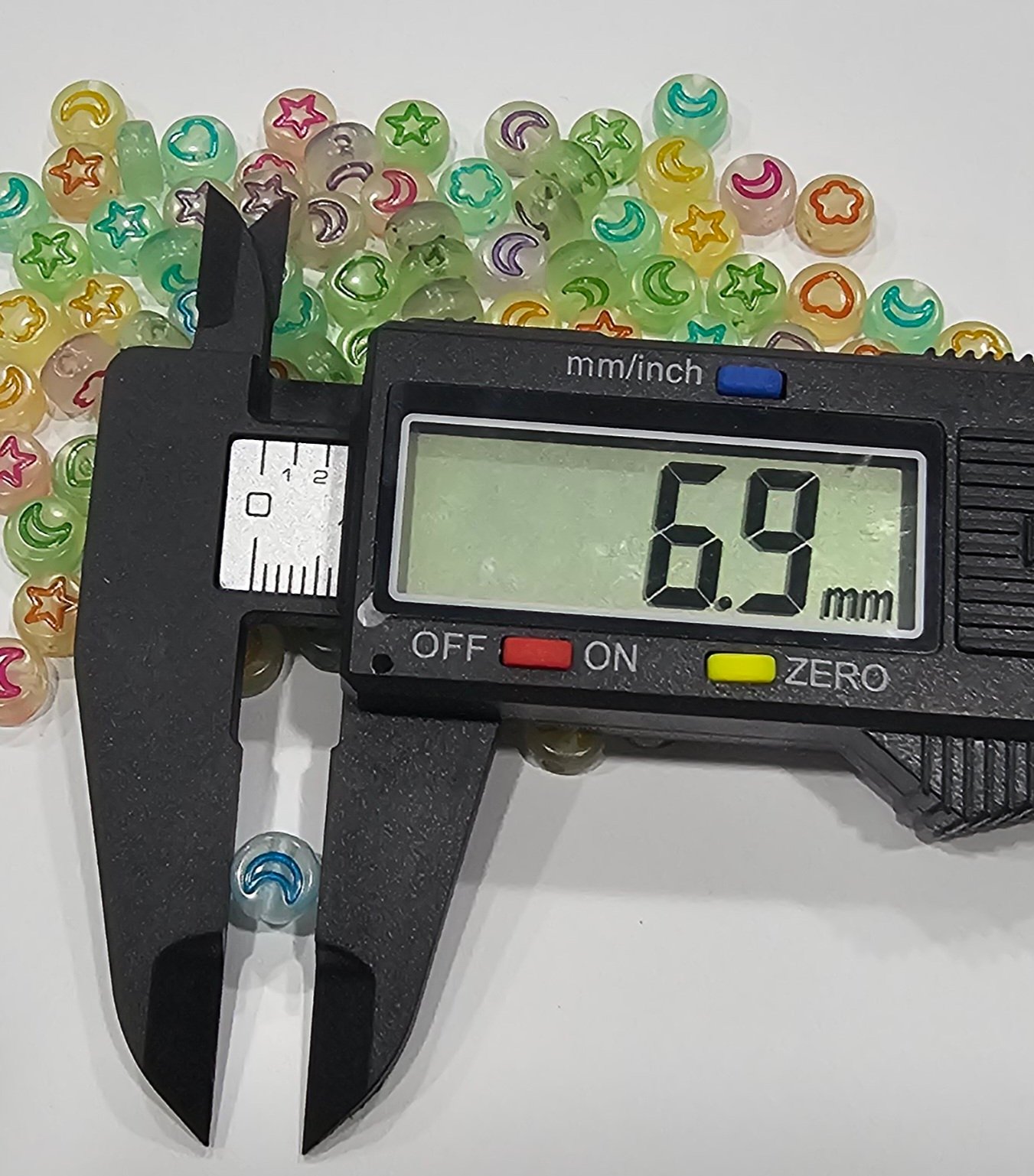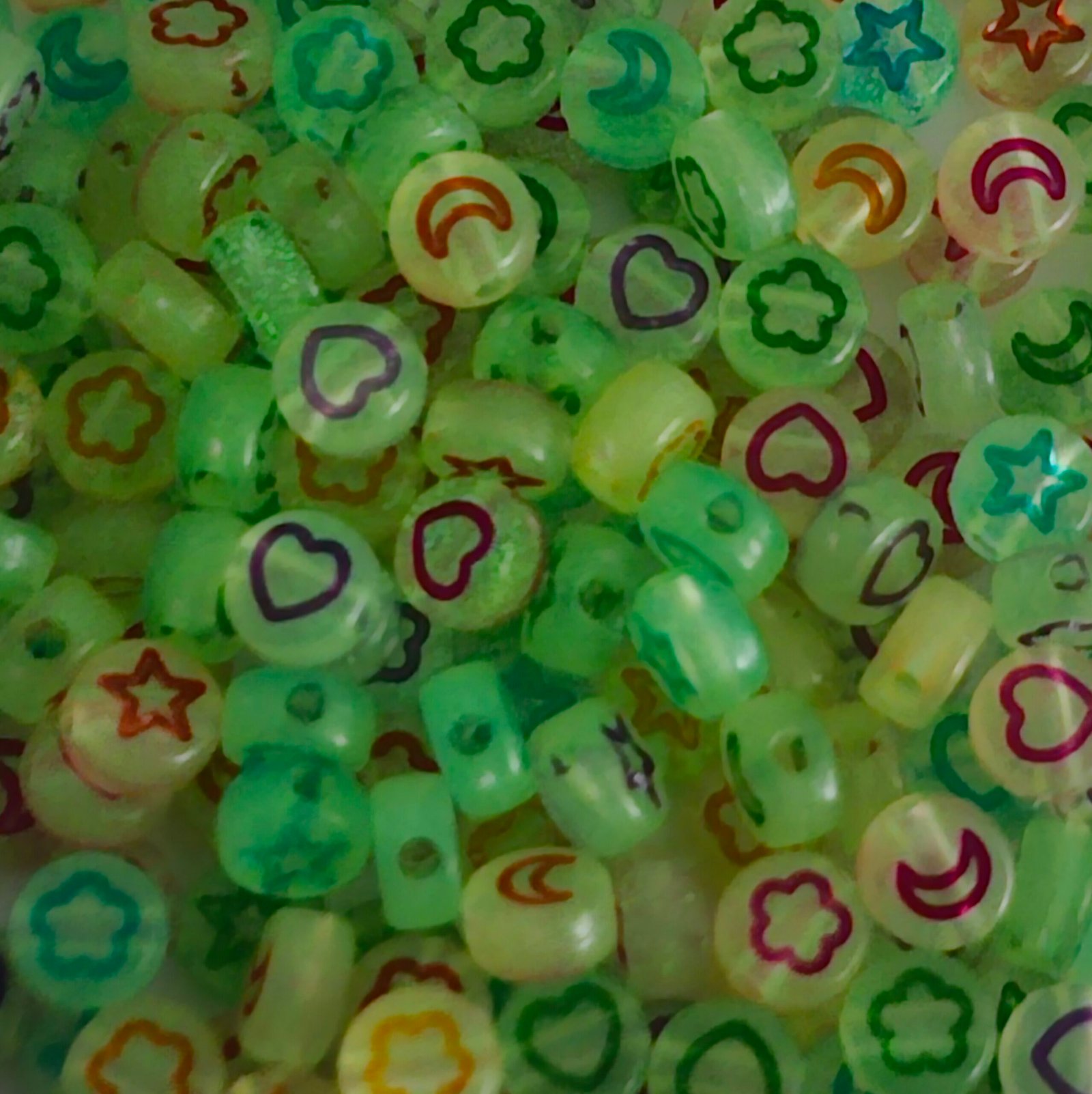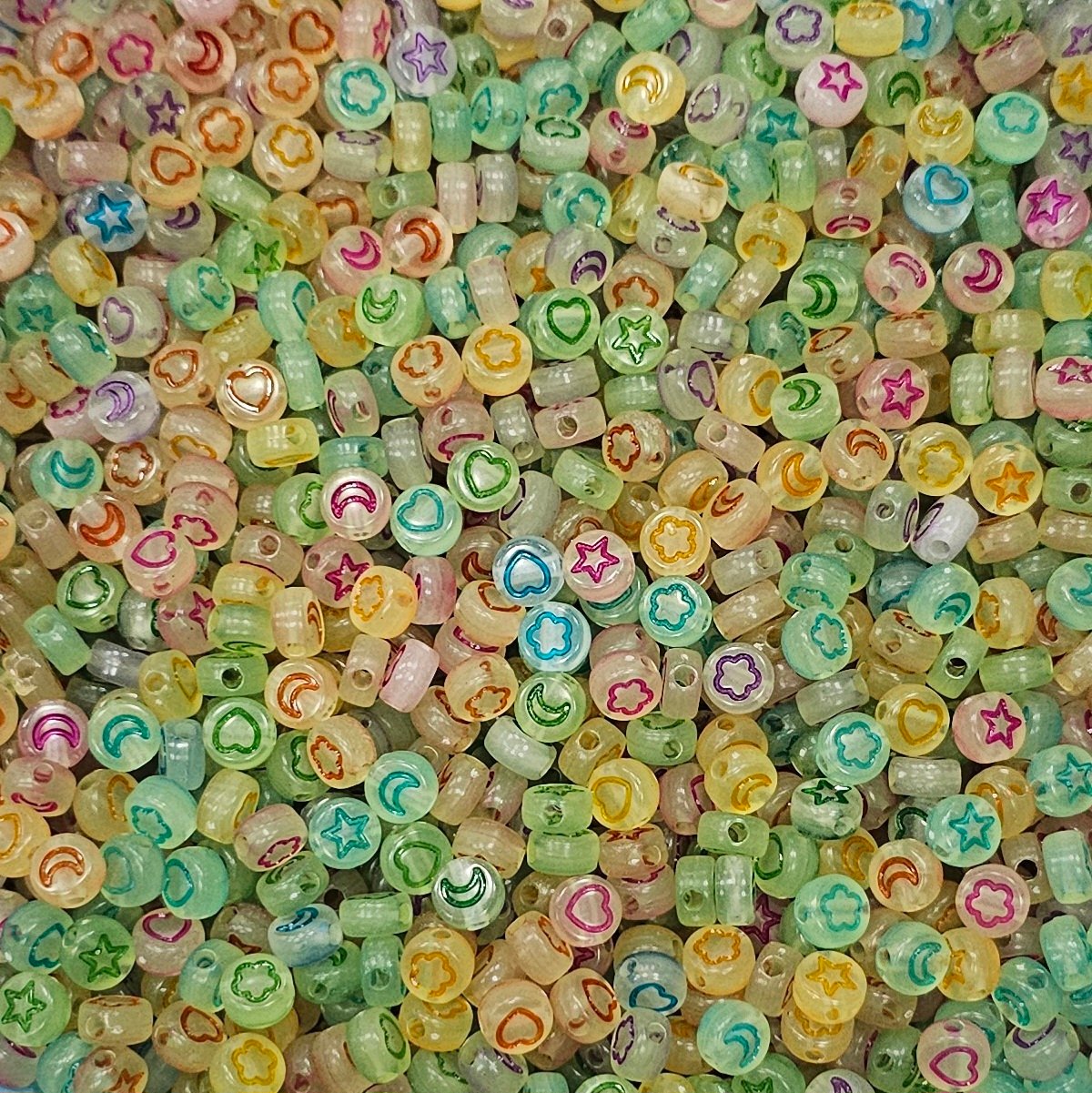Acrílico con forma de luneta fluorecente con figuras multicolor de 7x4mm en 3 presentaciones:
